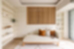 主人房設計以簡約風格為主,整體色調偏向柔和的白色與淡粉色,營造出溫馨舒適的氛圍。床上擺放著幾個粉色與米白色的靠枕,為房間增添了一抹柔和的色彩。窗邊是收納架與書桌設計,實用而不占空間,搭配大窗戶讓自然光充盈室內。牆面的簡單線條設計,讓空間顯得整潔有序,同時突顯了設計感,營造出寧靜而和諧的臥室氛圍。